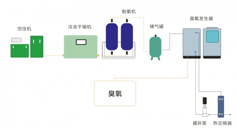富氧源臭氧系統(tǒng)主要包括:空氣壓縮機(jī)、兩級除油、除水過濾器、氣體顆粒過濾器;冷干機(jī)、制氧機(jī)、儲氣罐、臭氧發(fā)生器主機(jī);控制閥門和檢測儀表;臭氧和尾氣破壞系統(tǒng)組成。