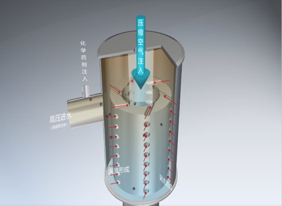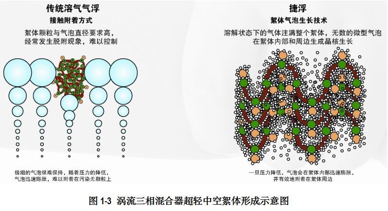 利用特殊研發(fā)的渦流三相混合器(見下圖),能完成高壓空氣溶解、藥劑分子拉伸提效、混凝絮凝攪拌(污染物捕集)、絮體形成、氣泡晶核生成和超輕中空化絮體形成的所有步驟。